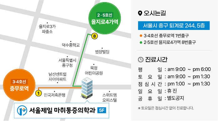 Address : Seoul Jung-gu Toegye-ro 244, 5th 7th floor 서울제일마취통증의학과의원
